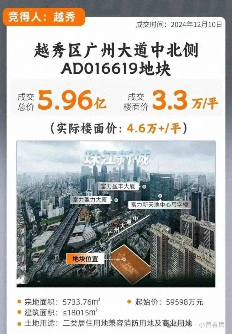 2024年12月越秀地产以59598万总价拿下越秀区广州大道中地块,扣除配建后,楼面价约4.6万/平。