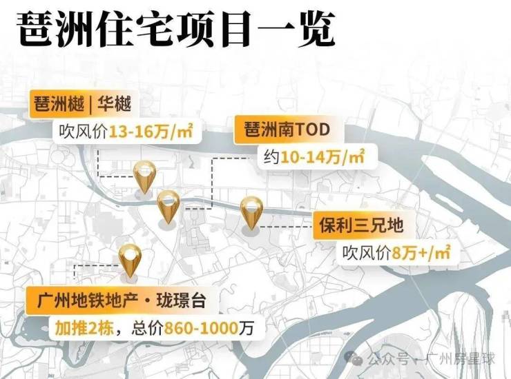 琶洲南TOD,在售尾货,均价还是10-14万/㎡;去年刚拍的保利三兄弟,吹风价8万+/㎡。