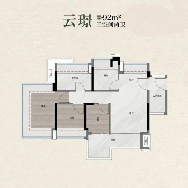 这个户型,同样也是卧室归南,只不过入户玄关位置,和89平户型不太一样。