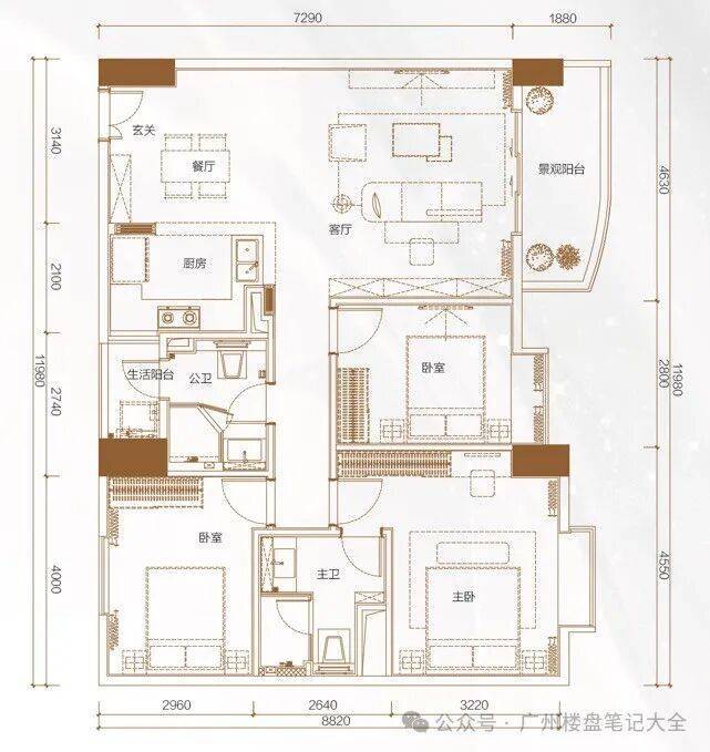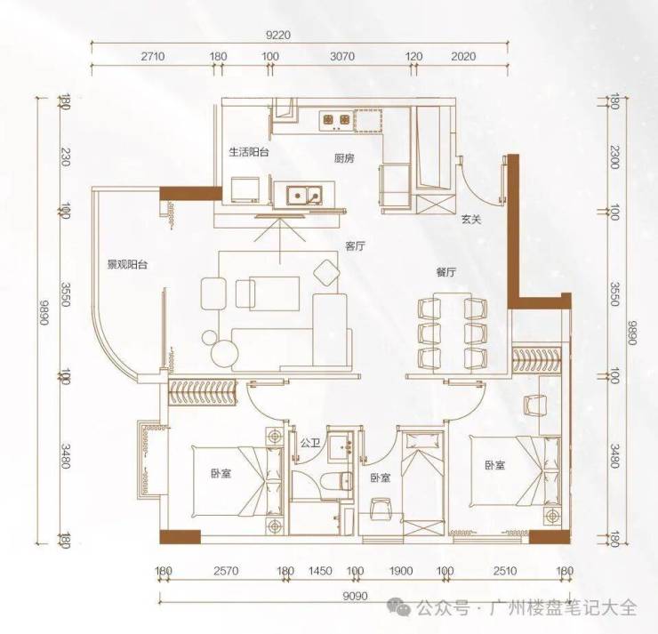 建面约93㎡园景户型,看中庭中央园林,阳台约180米宽楼距阔景园林