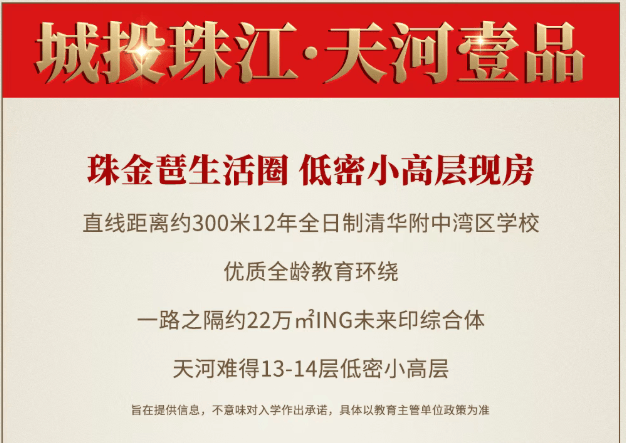 信息仅供参考:本资料所载一切文字、图片及信息仅供参考之用,不构成任何要约、承诺或建议,请务必以城投珠江天河壹品项目实际情况及开发商官方发布文件为准。