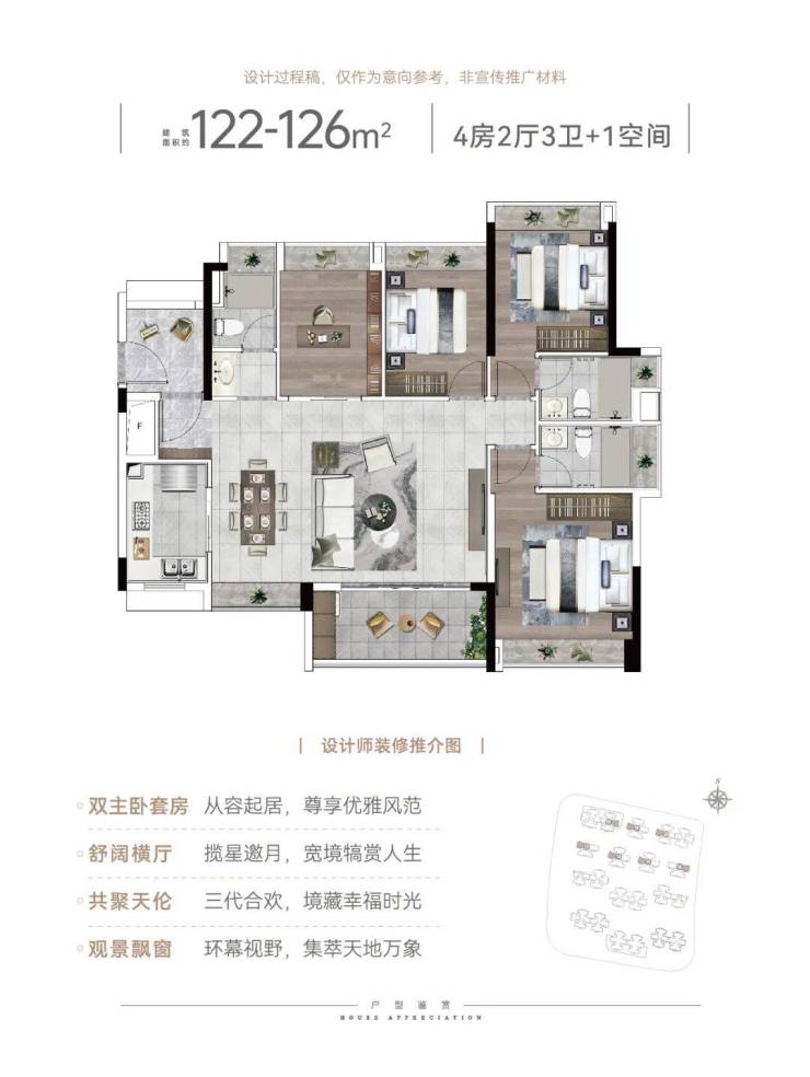 建面122-126平4+1房,双主套配置,四开间朝南采光,大横厅设计,全屋8个飘窗+入户花园+观景阳台+厨房窗户,整整11个采光面,所有卫生间都带飘窗。