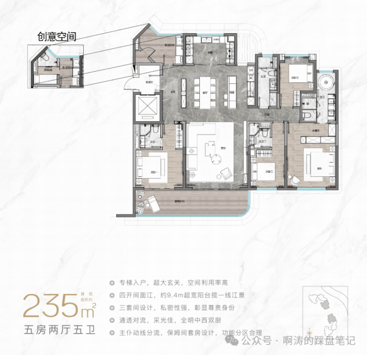 目前楼王产品璇湾壹号面积段为184-255㎡的4至5房,瞰江面最高18.3米,最高270°观景面,临江约100米。