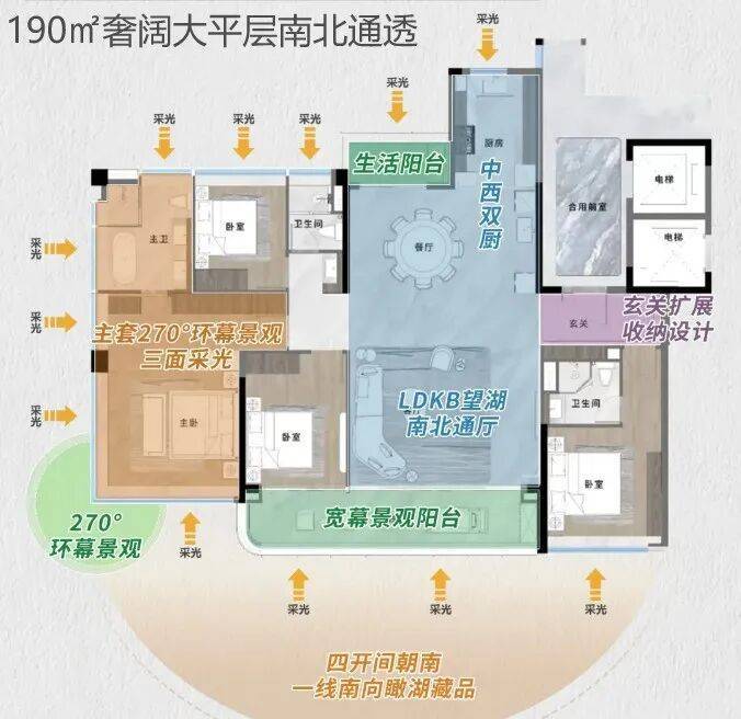 并且,下叠有南北双庭院、超57㎡客餐厅、中西双厨、挑高餐厅空间……