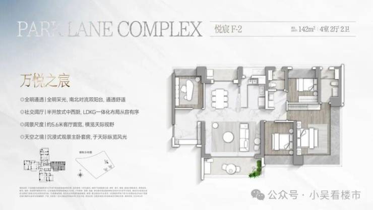 建面142平南北对流户型,4.85米客厅开间,客餐厨阳LDKG设计,8.4米阳台,客厅可打通旁边次卧做成8米宽大方厅主卧南北对流。