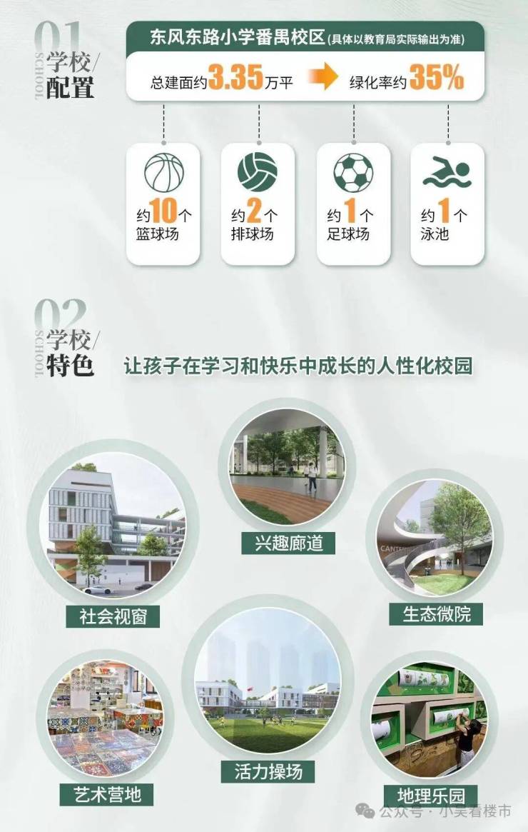 项目自身带有一所21班幼儿园{广东省番禺实验幼儿园},和72班公立小学{东风东小学},还有36班公办中学{广雅初中},基本上都确定为省一级学校,虽然现在遍地都是挂牌名校,但是有总比没有好,学校就在小区旁边,接送都很方便,基本上家门口就能实现目送式教育。