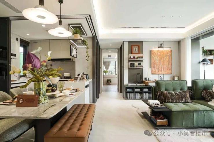 建面110平竖厅四房,进门预留了灵动空间,可以做瑜伽室或者游戏室,休息娱乐互不打扰,厨房不仅带岛台,还做了很多收纳空间,动线合理,储物无敌,次卧主卧书房朝南,公卫次卫朝北,动静分区,功能实用性+1,总价590万起。