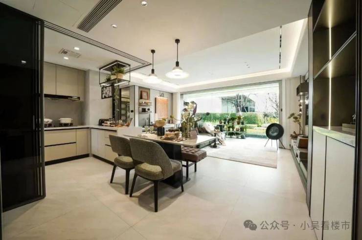可以容纳大家庭生活、亲朋好友聚会的阔绰客厅,功能齐备的半开放式中西厨,南向景观面拉满的超长阳台,整合于同一空间。即便是多代同堂,一家人的生活空间也绰绰有余。