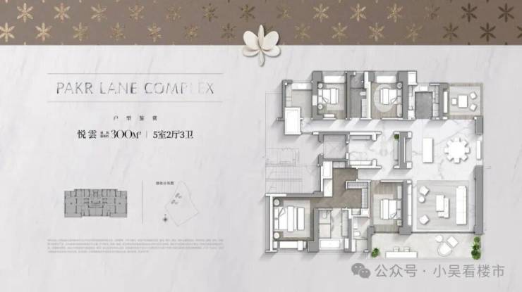 建面300平五房三卫,分别在11.12栋,三梯两户格局,每一户都是专梯入户,该户型可以做三个套房。