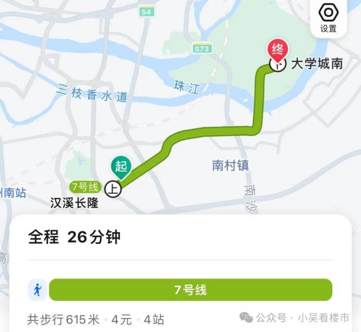 地铁去往大学城:出小区步行至地铁汉溪长隆站,乘坐7号线4个站直达大学城,耗时26分钟左右。