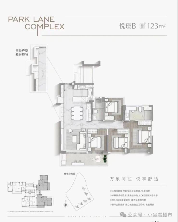 建面123平,半开放式中西厨,LDKG设计,约6.6米双面宽阳台,南向豪华主卧套房,独立梳妆台主卫设计,总价650-750万左右。