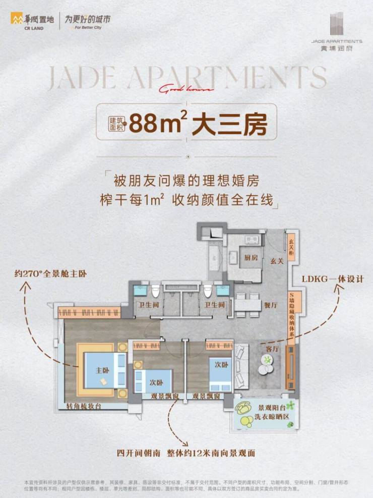 最小的建面约88㎡三房,也做到了四开间朝南,南向景观面约12米。