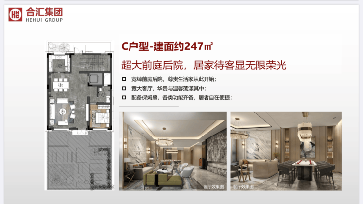 合汇璟园合汇璟园项目总占地面积约6.18万㎡,是由增城本土第一开发商,大师级品牌设计。合汇集团,创始于2004年,是一家异军突起的新锐房地产企业,以房地产开发为主业,涉及商业经营、物业管理、矿产资源开发等业务领域。项目邀请了众多名大师联手设计,其中有来自美国的全球顶尖规划建筑设计公司【匯张思】设计。园林设计上邀请了著名的山水比德,打造顶级别墅项目。