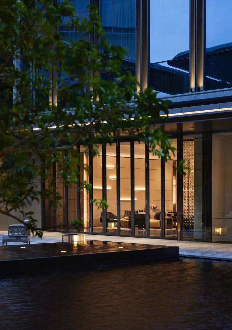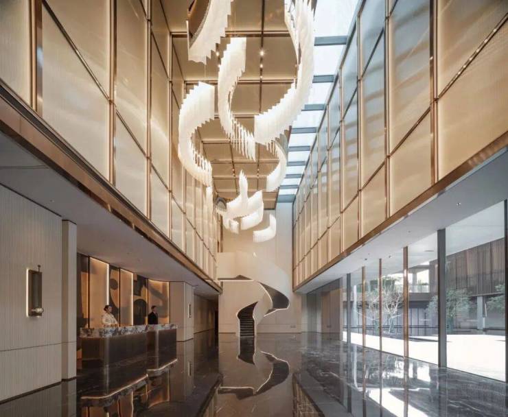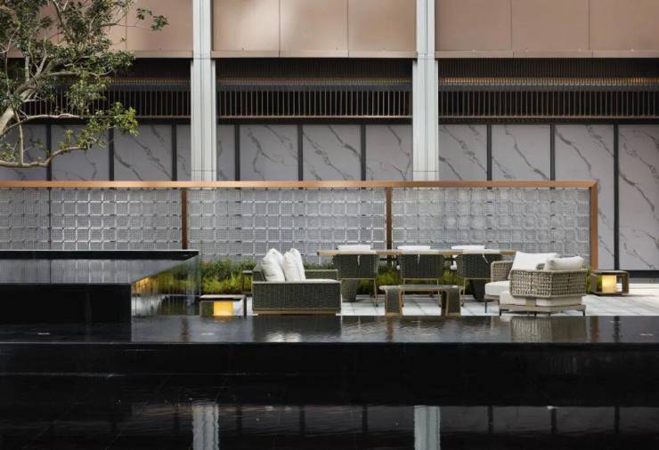 廊道高低错落、蜿蜒穿梭,格栅层叠如林,行至此间豁然开朗,泗水归堂的形制铺展眼前,阔池映天、高树蔽日,尽可静坐慢赏云卷云舒。设计以 “流通空间” 为核心理念,实现室内空间与庭院景致的无界对话,让室外风光自然渗透室内肌理;连廊细节精工雕琢,百叶装置可开可合,营造出丰富多变的空间体验,尽显项目的精致格调。