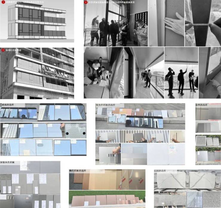 借助模型精准落位幕墙构造细节、打造标准段幕墙,细致复核幕墙交接节点与材料上墙效果,筑牢施工落地根基。团队开展大范围材料甄选,历经多轮对比筛选,反复校验材料与实际大面落地效果的契合度,对材料搭配秉持精益求精的态度,以严苛标准精准还原设计初衷与视觉效果。
