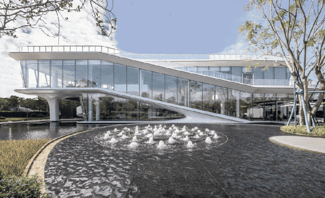 城市展厅以 “湾区云翼” 为设计概念,采用机翼仿生形态,入口抬升塑造空间昭示性,螺旋流线作为动线核心,实现一二层空间的无界串联,最终营造出流畅开阔、纯粹通透且兼具艺术质感的展陈场域。