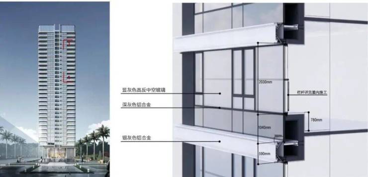 塔楼主体墙身采用银灰色铝板搭配双层玻璃类幕墙系统,整体立面公建化质感鲜明,塑造出轻盈整洁、极致通透的建筑表皮,兼具灵动韵律与细腻光泽。随阳光流转,幕墙表皮折射出层次丰富的动态光彩,让建筑形态在光影变幻中更富生命力。
