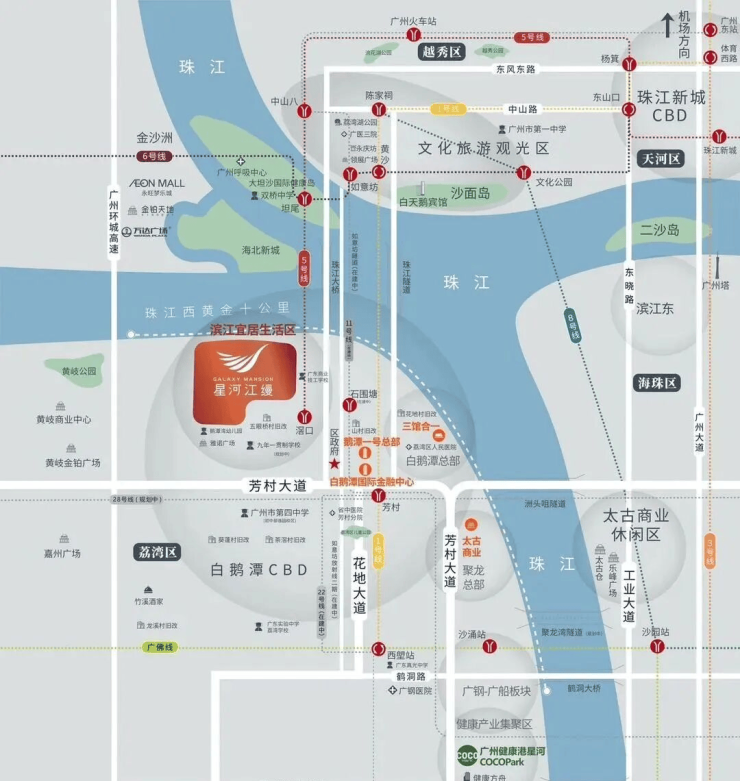 项目约750m即达5号线地铁滘口站,30分钟直达珠江新城,白鹅潭未来有超10条地铁线路穿过,覆盖大湾区1小时交通生活圈