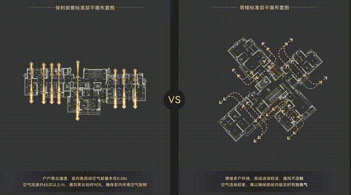 利琅誉,户户坐北朝南,实现真正意义上的南北对流,确保室内环境空气清新。而塔楼多户环绕,房间进深较深,通风不流畅,空气流线较差,难以确保房间内及时有效换气。