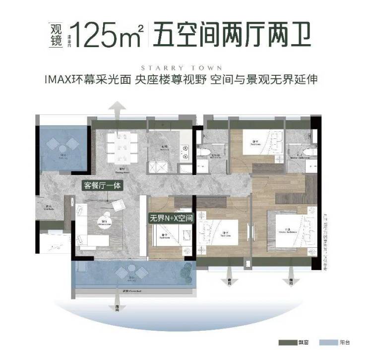 - 125㎡四房两卫:改善户型,四开间朝南,南北通透,视野佳