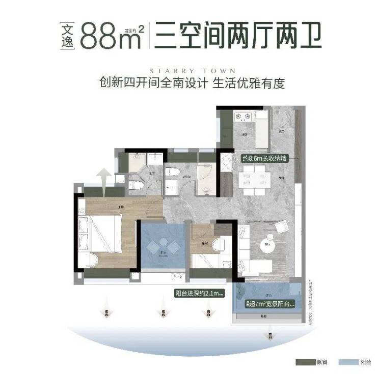 - 88㎡三房两卫:刚需主力,四开间朝南,采光好,实用率高