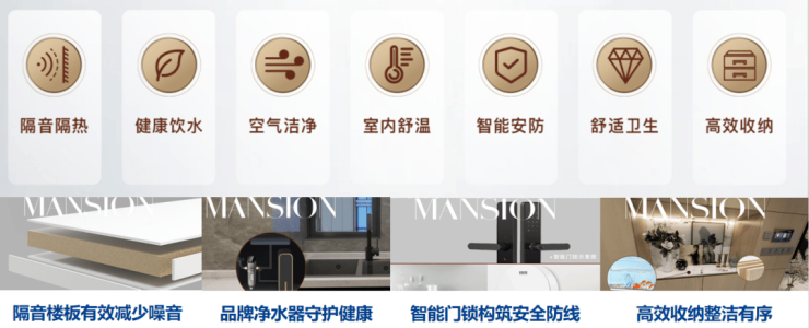 7重人居峯境系统、双智能中控屏、一键呼梯、VRV中央空调、新风系统、智能自动窗帘,更率先将飘窗+阳台纱窗纳入统一交付标准。