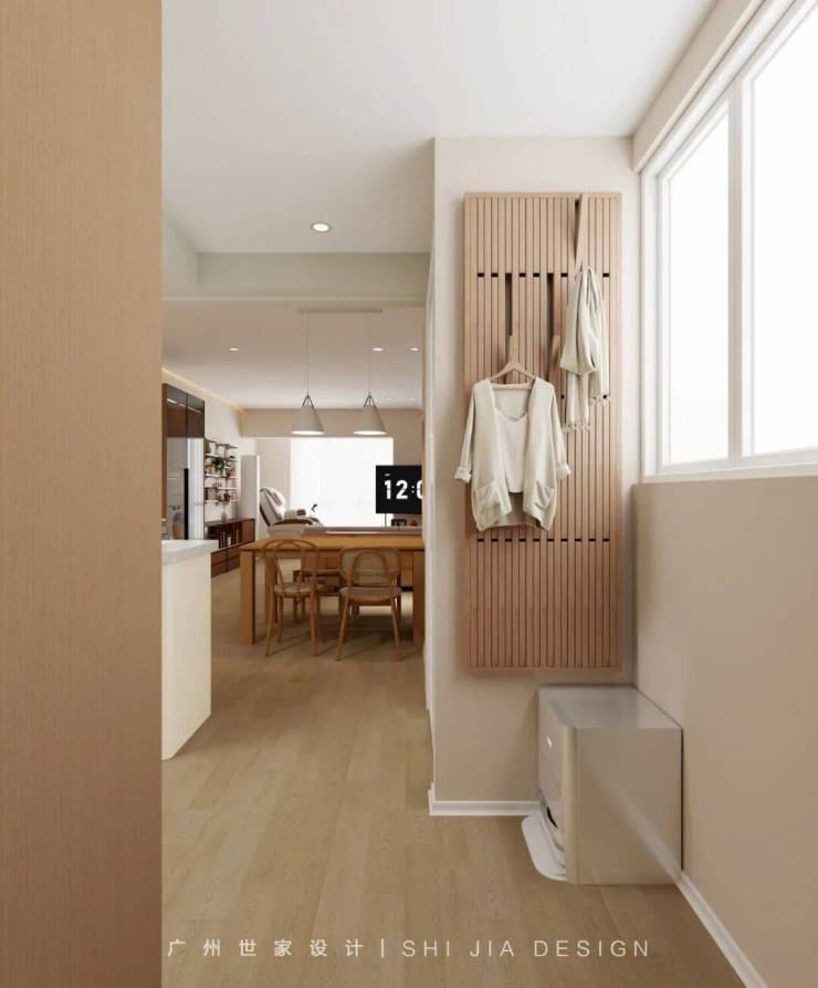 入户空间不足,采用定制鞋柜+挂衣架设计,满足入户鞋包收纳的需求。扫地机器人也放置在玄关处,方便沿着居进门后的行动路线进行清洁。
