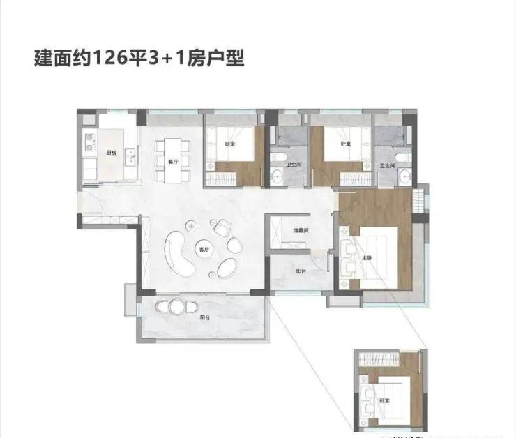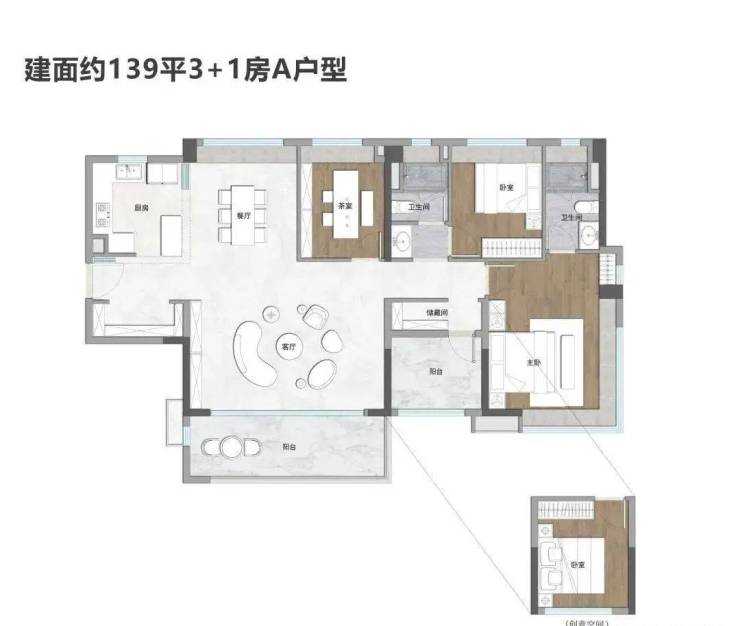 户型设计上,保利·领秀海还藏了不少巧思。有建面约74、84、95、120、126、139平三至四房设计,非常丰富。