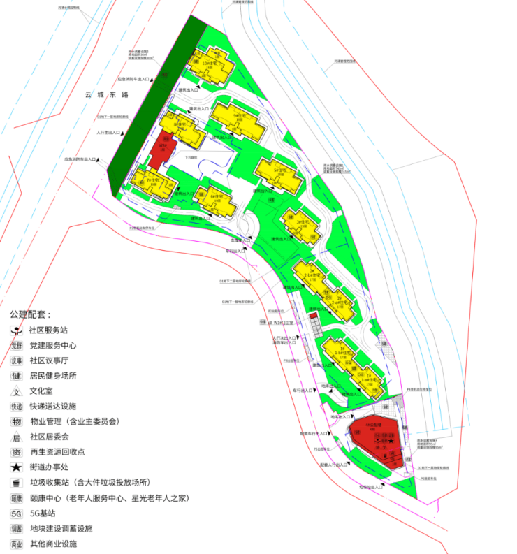 出入口规划:小区主入口位于云城东路侧,实现人车分流,车行入口与人行入口分离,保障社区内部安全与静谧。