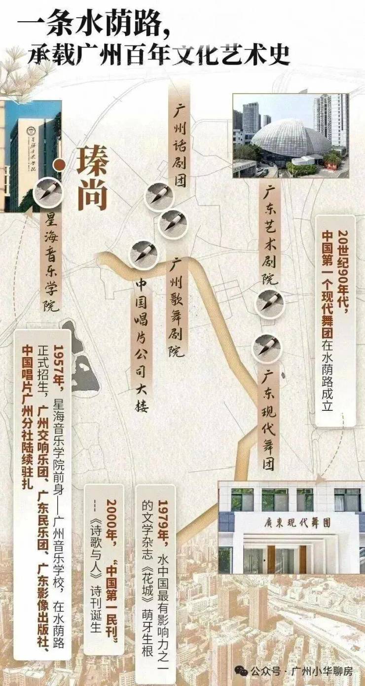 如今,短短1公里的水荫路,集聚广州歌舞剧院、广州话剧团、星海音乐学院、中国唱片公司大楼......数十家文化机构、上百位艺术人群。