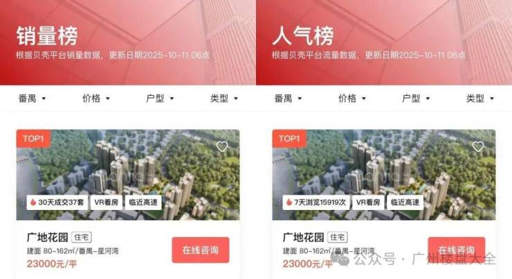 贝壳近期的番禺区销量榜、人气榜第一名,也都是广地花园。