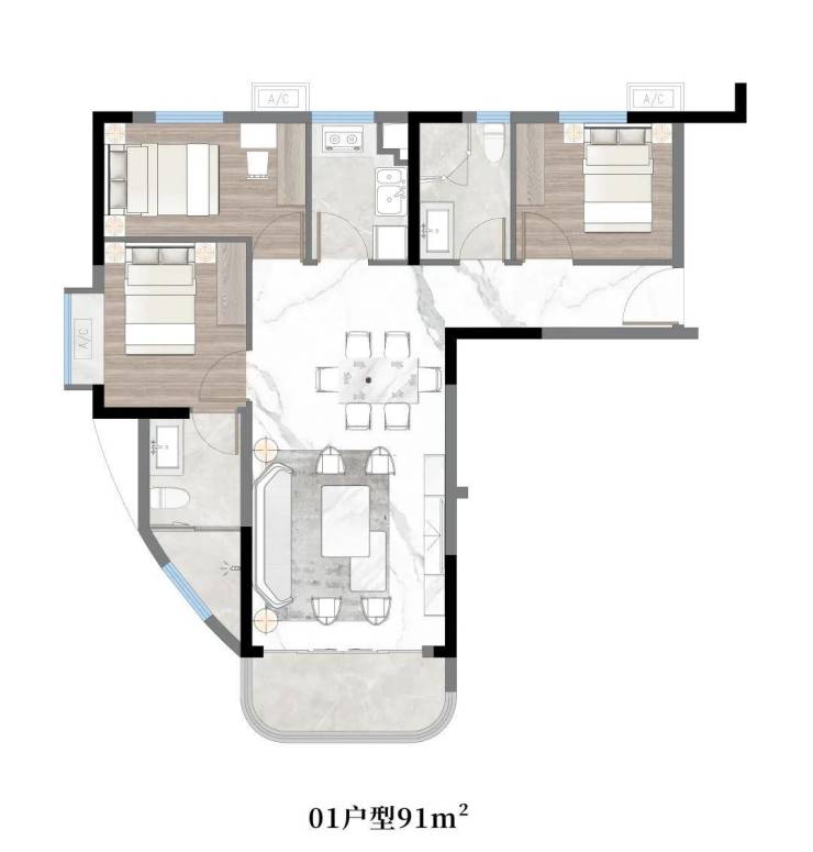 01户型:约91㎡,三房两厅两卫带主套