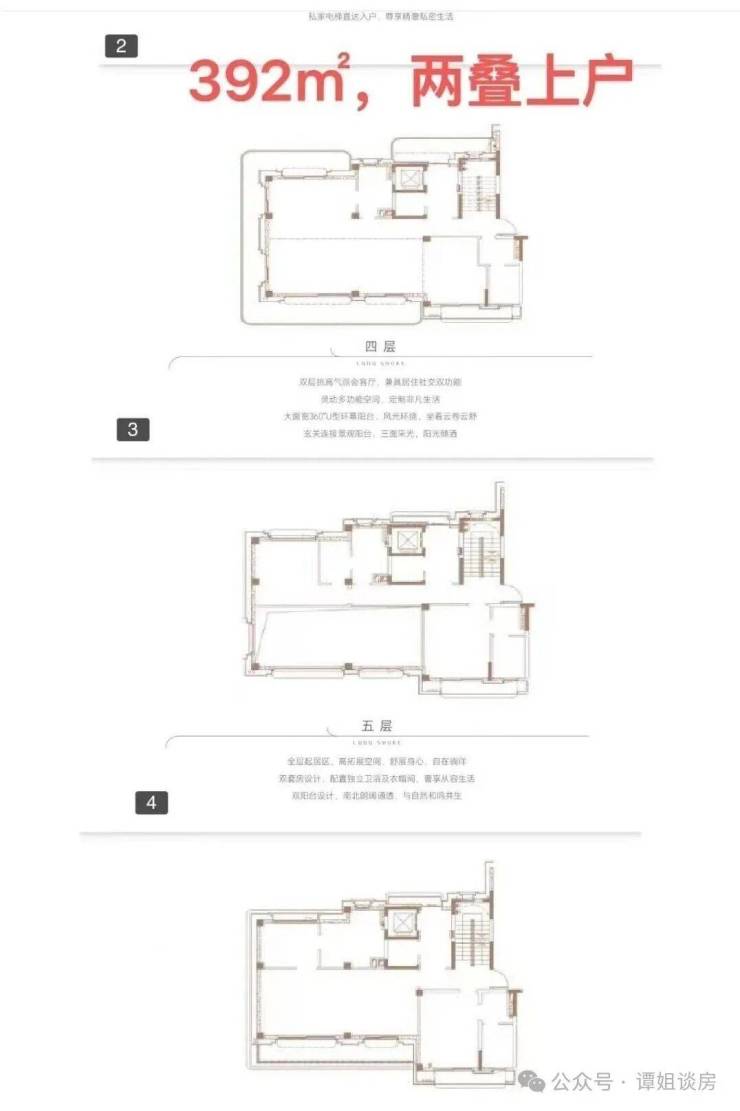 其中,两叠的上叠面积为392㎡,花园面积区间约为123-298㎡,天台面积约为93㎡,实用率193-259%;
