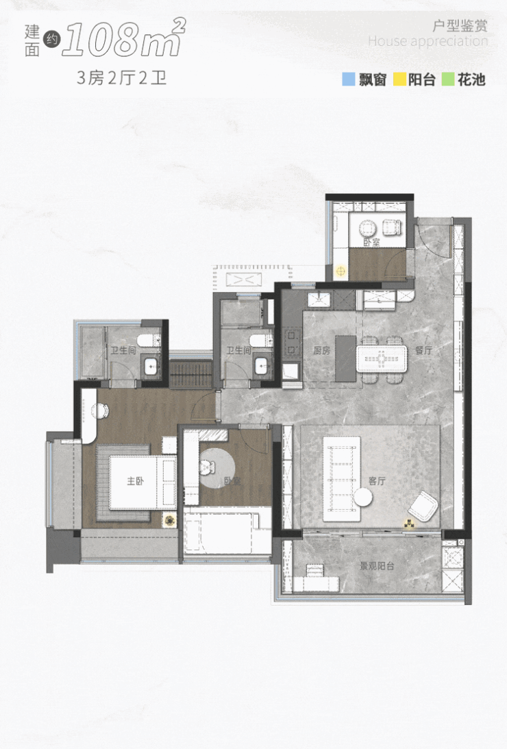 建面约108㎡户型采用经典直厅出阳台+LDKG一体化设计,超100%使用率,没有一味的追求房间数量,尺度很舒适。
