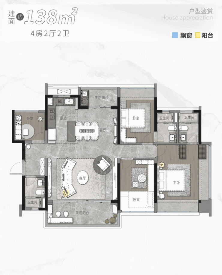 建面约138㎡4房户型,无论是南向的舒适度、还是各个空间的奢阔程度,都是顶级享受。