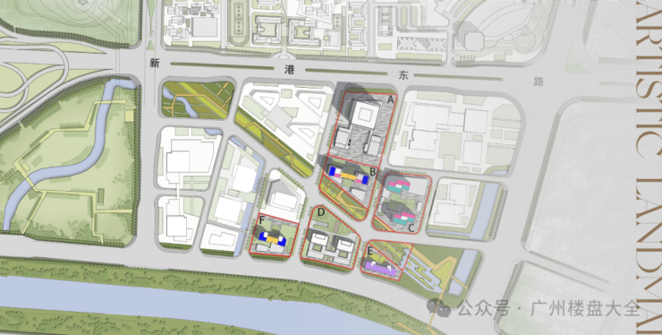项目占地超过7万㎡,共有6宗地块,分别为A、B、C、D、E、F地块,定位“琶洲中二区核心区水滨地标”,业态以办公和商业为主,也有少量公建配套。