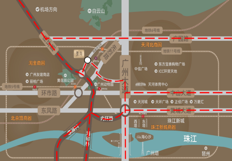 20分钟内可抵达环市东、珠江新城、北京路、白云新城等主轴商圈,周边环伺太古汇、万菱汇、正佳广场、天河城购物中心、ICC环贸天地等大型综合商业,满足多元消费需求。
