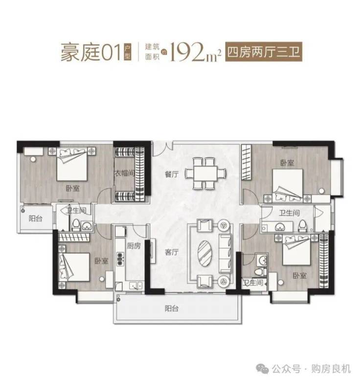 豪庭01单元——【 192㎡ 东南向 四房两厅三卫 】