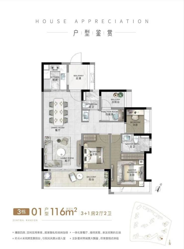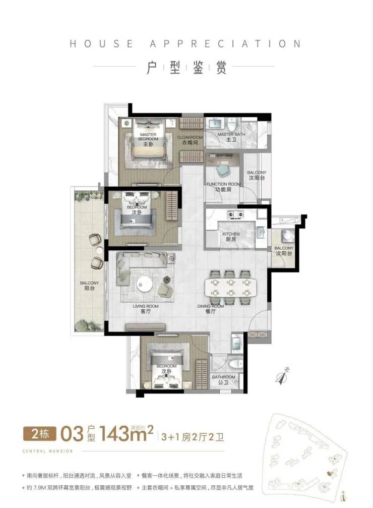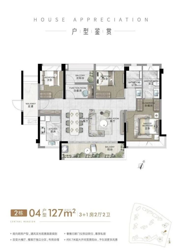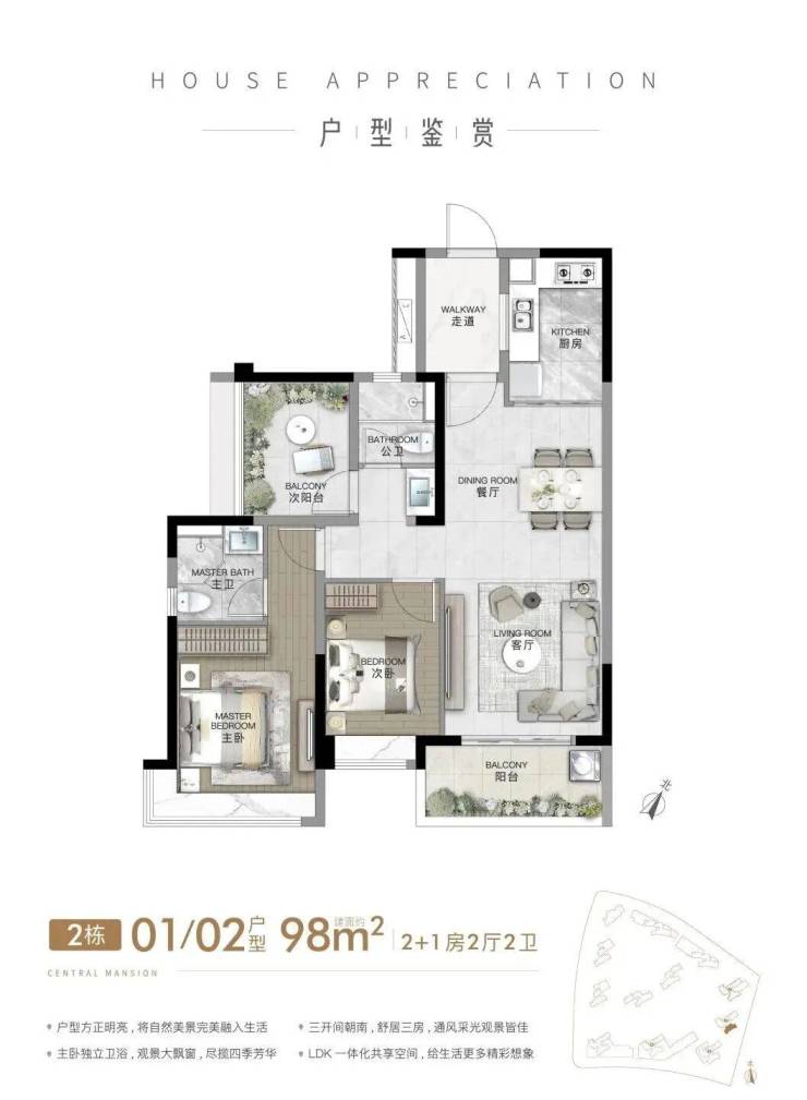 四开间朝南向和双阳台设计,阳光清风铺满全市,是市面上少有的真正舒适健康大宅。