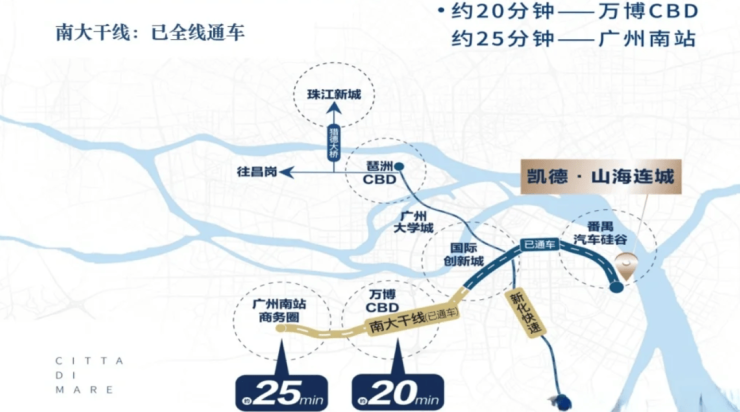 但还好项目自驾比较方便。目前,南大干线已全线贯通,前往南站、万博、大学城、创新湾等地都十分便捷。