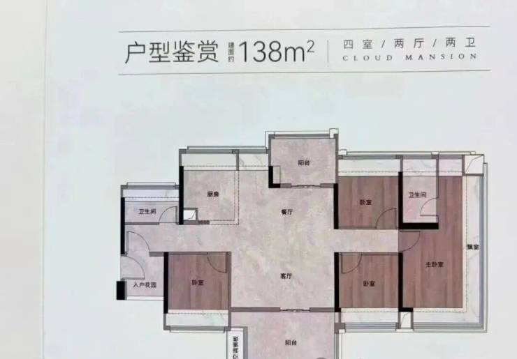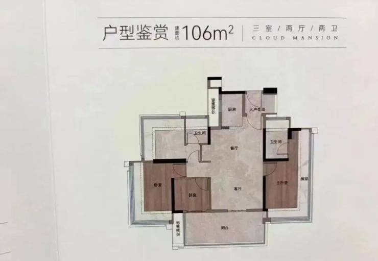 建面约106㎡户型,东南朝向,比较大的优势就是,高层房源可以看到云山景观。