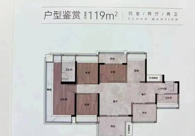 建面约119㎡户型,则是西南望城景朝向,比较靠近小区一面,相对安静。