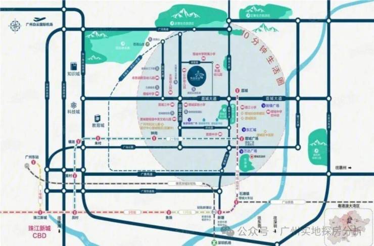 项目靠近地铁21号线增城广场站、钟岗站,快线5站可达天河,随着增城第二机场建设,区域多维交通路网逐步完善,TOD交通枢纽效应凸显,提升出行效率。