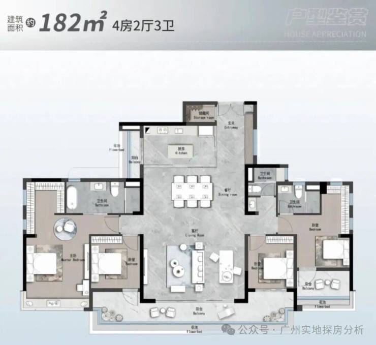 建面105㎡的四房两厅两卫,约6.2米宽景阳台,阔奢主套设计,LDK一体化。