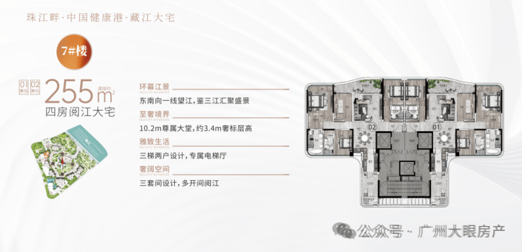 户型:建面约233-285㎡四至五房,东向/东南向一线望江,极致3.4-3.6m层高