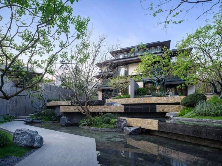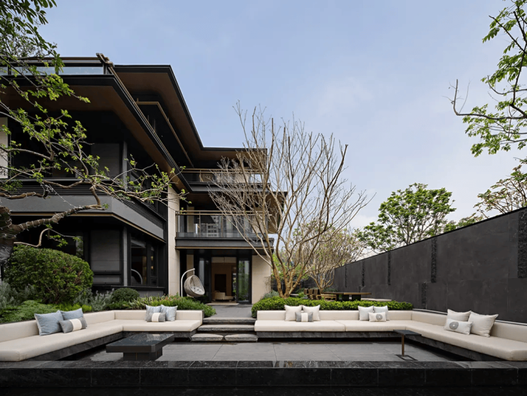 传统别墅产品营造的多以建筑为核心,而将室外庭院空间当做住宅的附属品,在这一点上,金地·御湖颂以前院后院设计,使单套建筑拥有更好的围合院落,赋予庭院的功能属性与空间私域感。三层L型围合建筑,三面高采光和高私密性、整体布局更加舒朗,景观视野更加开阔;各个功能空间以院子为核心,皆能享受到庭院景观;前后院的设计方式,使建筑有了“通透”感,目之所及皆透亮开阔,实现舒适与尊贵感并存。