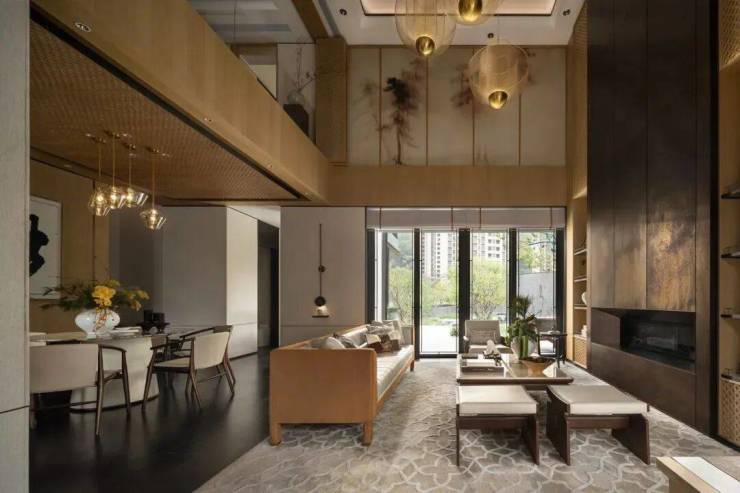 横平竖直的空间线条里,写意纹理如水墨般晕染开来,麻布、不锈钢、玻璃、实木等材质亦悄然置入,东方情韵与现代骨骼大胆融合,相得益彰。