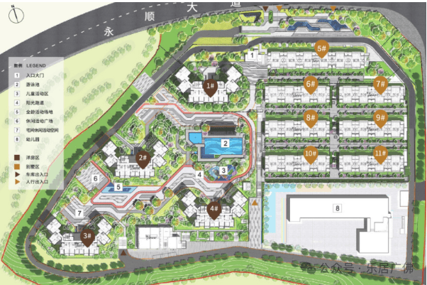 产品方面:开发商选择了高低配设计,其中高层洋房4栋、叠墅7栋、幼儿园1所。