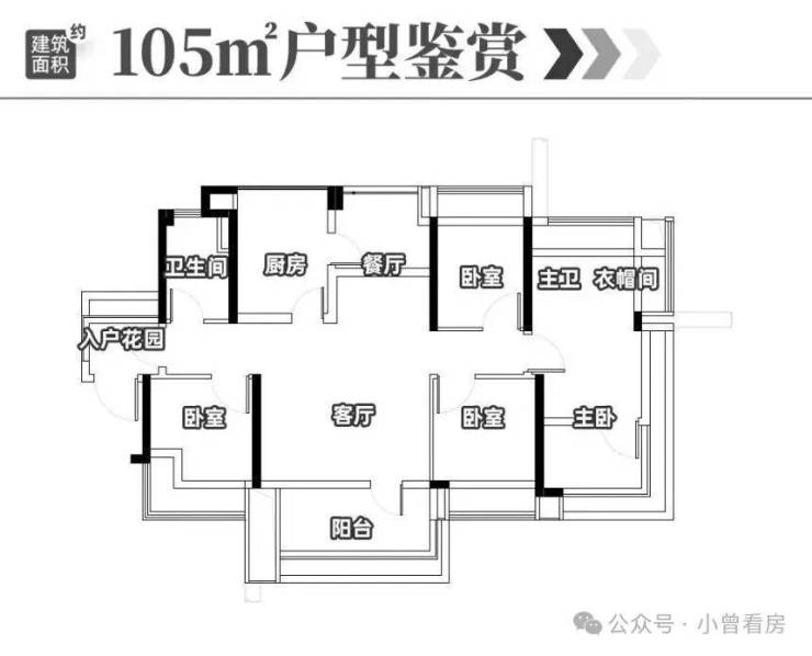 其中,建面约105㎡的四室两厅两卫是东南单边套设计,南向阳台能看到城市景观,北向则正对着中央公园,早晚能收获不同的视野体验,空间布局方正,小户型也能满足全家居住需求 。