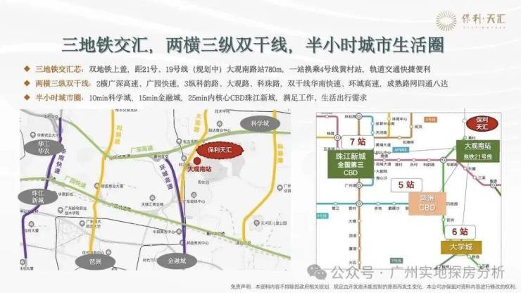 项目距离地铁21号线大观南路站约1.5公里,一站换乘4号线去往金融城、琶洲,4站到员村换乘5号线直抵珠江新城。距离最近公交站大观中路南站约500米。自驾周边有大观路、沈海高速、广深高速、广园快线、环城高速,还有在建的机场第二高速。